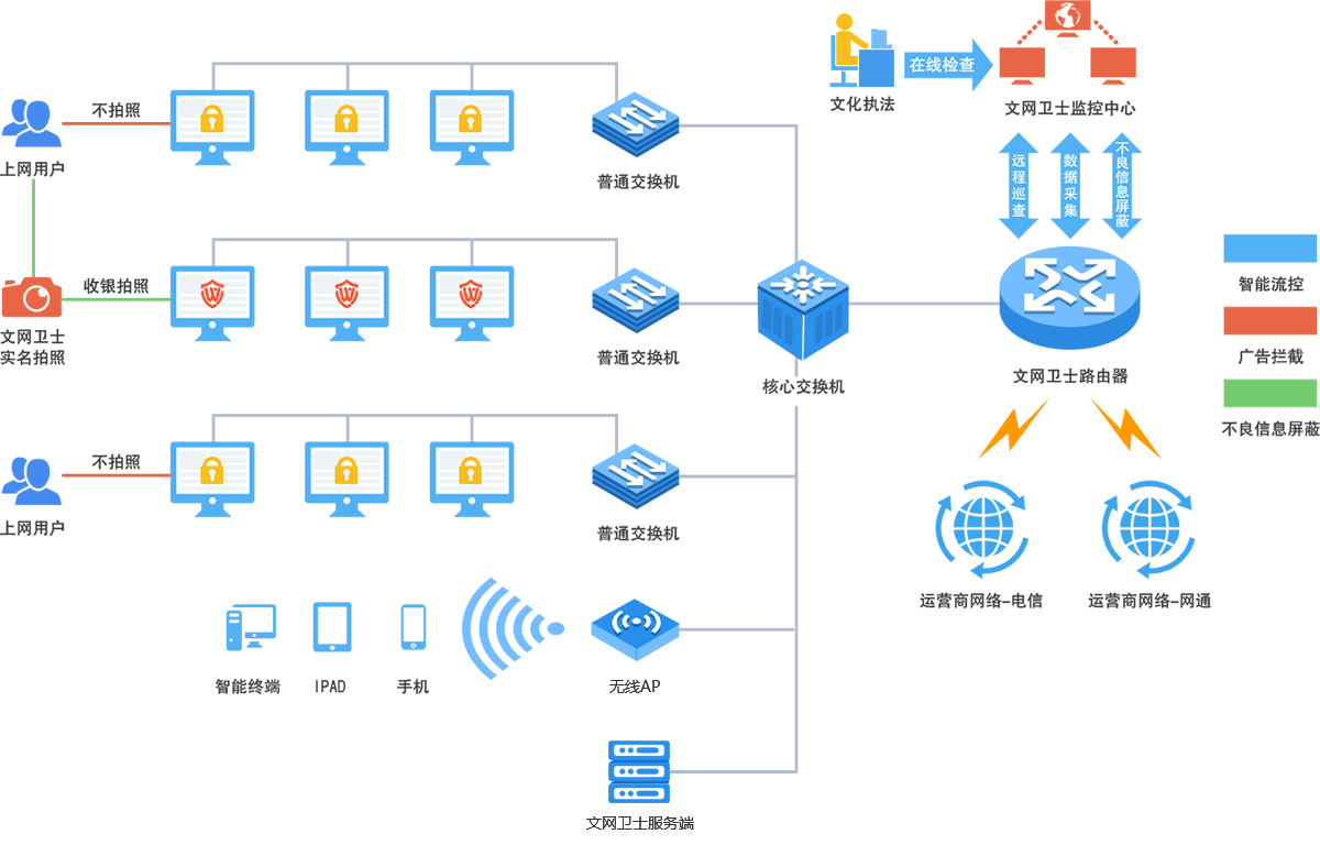 《文網(wǎng)衛(wèi)士》網(wǎng)吧監(jiān)管系統(tǒng),包括路由器、客戶端和移動執(zhí)法APP,是一套多功能、全方位的互聯(lián)網(wǎng)營業(yè)場所監(jiān)管系統(tǒng)。